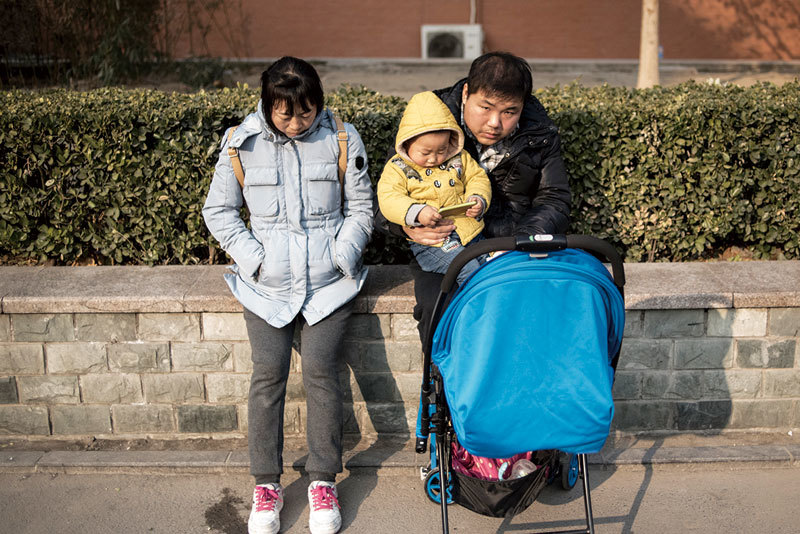 父母被高昂的教育成本壓得喘不過氣來。圖為2016年1月1日,北京街頭的一對夫婦與他們的孩子。(Fred Dufour / AFP)