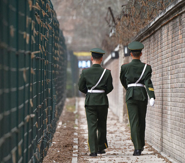 「牆國」之内,英雄無用武之地,年輕人也難有光明的未來。圖為2018年3月28日,正在巡邏的北京中國武警。(Greg Baker / AFP)