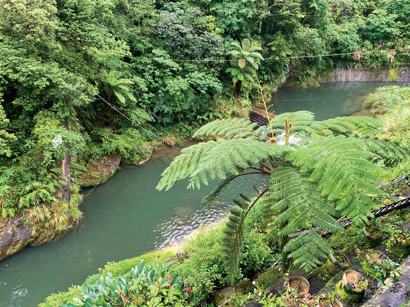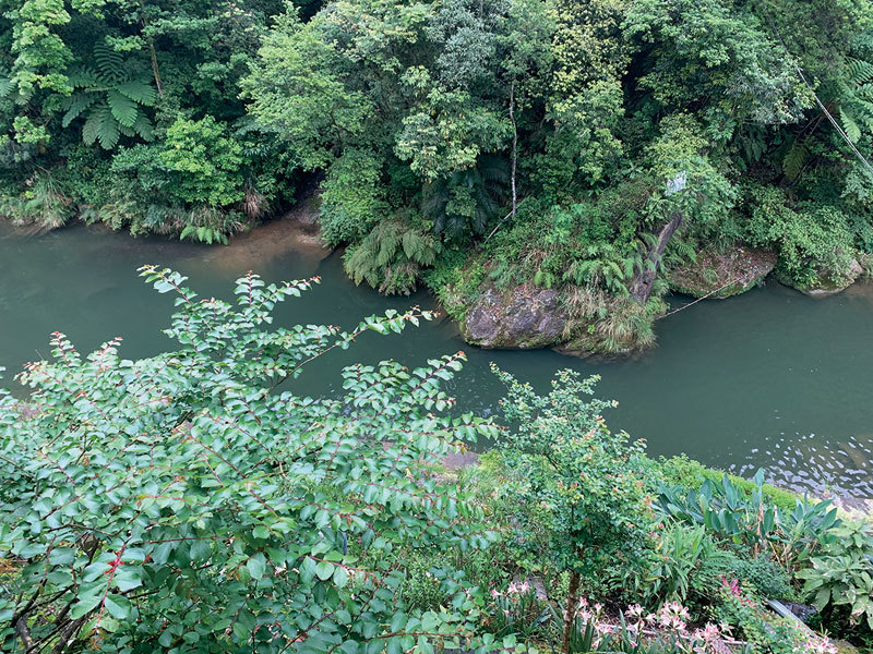 豈止鄉花,吳金池說這裡的筆筒樹一直被盜伐,商人拿去賣給種蘭花的。這一帶的林相有很大的改變,自1989年回來定居後,他努力復育原生種花草樹木。從吳金池的咖啡館望下去,可以看到竿蓁林溪還矗立著幾棵筆筒樹(與雙扇蕨同為恐龍時代就有的植物),是他的復育成果。聽他說從前這裡三、四月時,滿山遍野的金毛杜鵑,還有白鷹石上的豔紅鹿子百合,滿山紅,楓樹、櫻花四季輪換的生態景致分明。從前有位駐日大使經常帶日本友人來這,因這兒很像日本的瀨戶溪。
