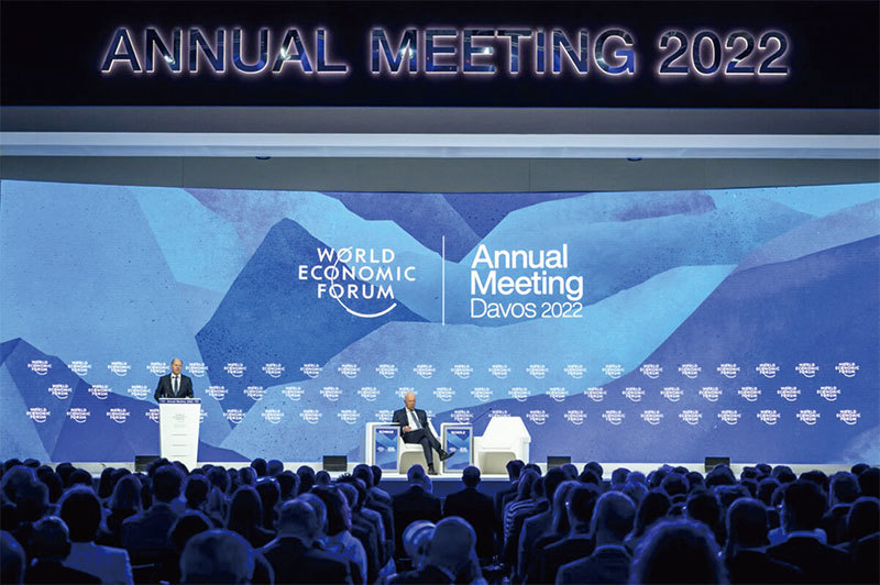 利益相關者資本主義是世界經濟論壇所呼籲的。圖為2022年5月26日,德國總理奧拉夫.肖爾茨在世界經濟論壇年會上發表演講。他旁邊是論壇創始人兼執行主席克勞斯.施瓦布。(Fabrice Coffrini/AFP)