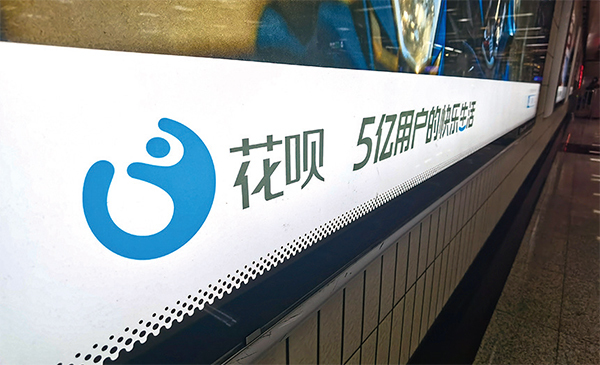 在大陸的年輕群體中,包括網貸、銀行卡的借貸產品的滲透率已達到86.6%。截至2020年初,有3億人開通螞蟻花唄,其中有1.5億人負債。圖為上海地鐵站的「花唄」廣告牌。(Wang Gang / VCG / Getty Images)