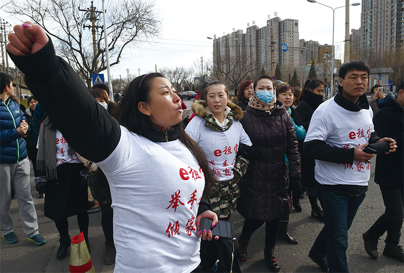 除了螞蟻金服,中國互聯網上還有很多網貸平台,發放短期貸款幾乎沒對學生還款能力進行審查,貸款的年化利率則達到15%到24%。圖為網貸平台爆雷,受害的投資人上街抗議。(Greg Baker / AFP)
