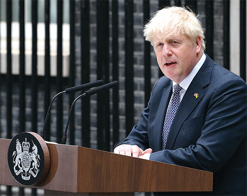 2022年7月7日,英國首相鮑里斯.約翰遜在倫敦唐寧街10號前發表聲明,辭去保守黨領袖的職務。(Daniel Leal / AFP)