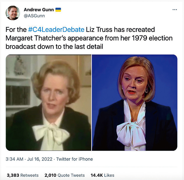 在競選第一場電視辯論中,特拉斯身著黑色西裝外套、搭配帶有大蝴蝶結的白色襯衫。有網民發現,這與撒切爾夫人角逐1979年大選時所穿的一套服裝驚人相似。
