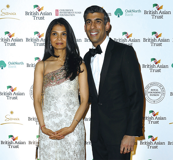 2020年2月蘇納克出任英國財政大臣,住在唐寧街11號,但他為人低調,不被關注,直到一天早上他腳踩一雙小白鞋,暴露了他富有的身分,妻子是印度大亨的女兒。圖為2022年2月9日蘇納克夫婦出席活動。(Tristan Fewings / AFP)