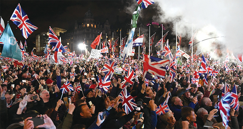 2020年1月31日,英國民眾在倫敦國會廣場慶祝英國正式脫離歐盟。(Daniel Leal / AFP)