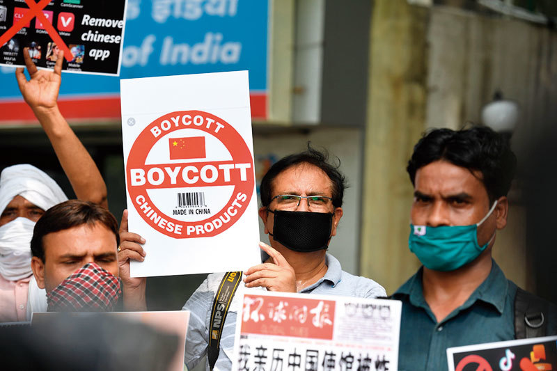 2020年,印度禁用了包括TikTok在內的100多個中國應用程序,稱這些應用程序「未經授權,竊取和祕密傳輸用戶數據」。圖爲2020年6月30日,印度記者們敦促國民刪除中國應用程序。(Prakash Singh / AFP)