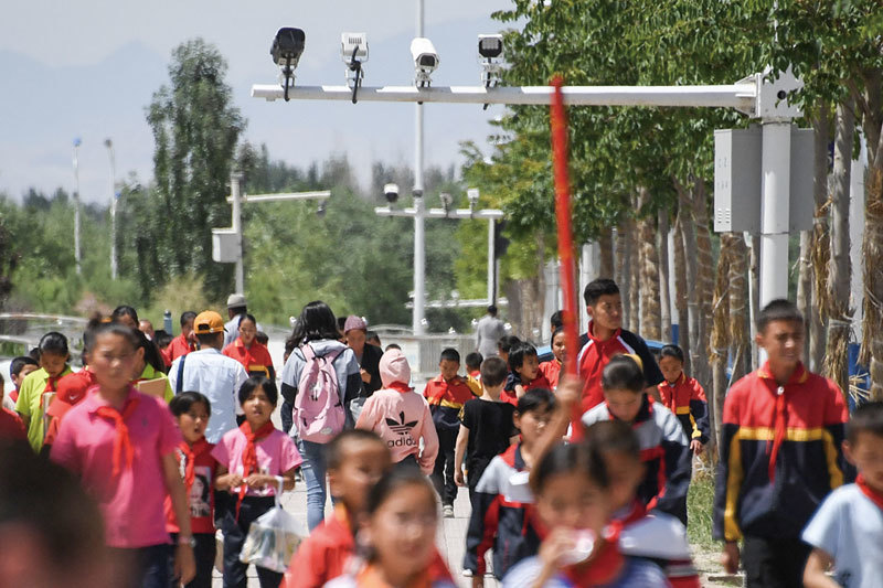 北京利用搜索引擎的搜索結果助長中共的政治宣傳,呈現扭曲的觀點。圖為2019年6月4日,新疆地區喀什南部阿克托學童在監控攝像頭下行走。(Greg Baker / AFP)