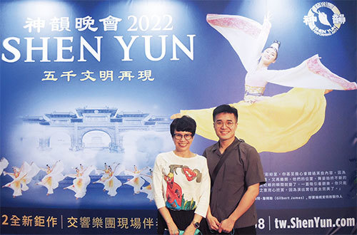 2022年7月5日晚間,桃園楊梅永欣扶輪社創社社長楊淑戀偕兒子觀賞神韻國際藝術團在苗栗縣苗北藝文中心首場演出。(攝影/李韻)