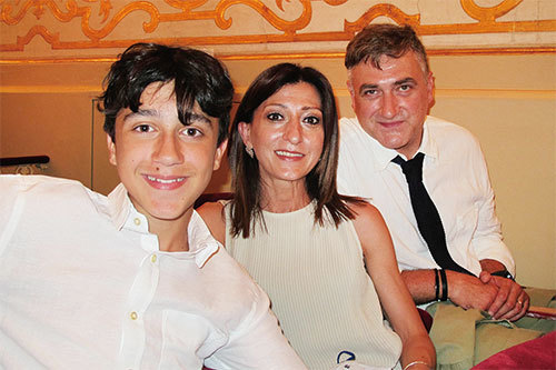 2022年6月22日晚,意大利帕瑪地區的民謠歌手和詞曲作者Ugi Cattabiani和妻子Paola Danzi及兒子觀賞了神韻紐約藝術團在帕瑪皇家歌劇院的第二場演出。(攝影/麥蕾)