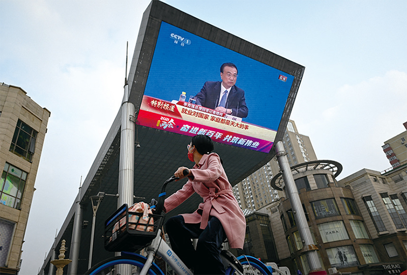 中共二十大高層政治格局確定前,一些官員騎牆觀望,對李克強要求的「穩經濟」不買帳。圖為2021年3月11日,中共人大閉幕後,北京街頭一個大螢幕播放總理李克強記者會。(STR / AFP)
