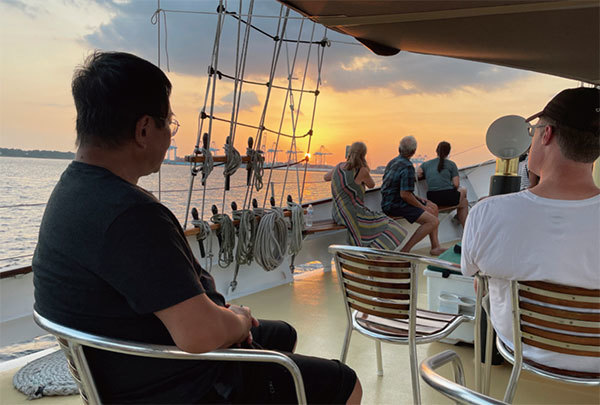 石山在工作之餘,亦很喜歡遊山玩水,他曾帶領我們一大群人去塔門島。我們坐在寬闊並傾斜的草地上,眼前是遼闊無盡的大海,背後是愜意的牛群,當涼爽的海風吹來,他心生喜悅,戴起耳機聽歌。我問他在香港生活多年,塔門的景色在他心中排名第幾,他回答是第二,第一是太平山的夜景。