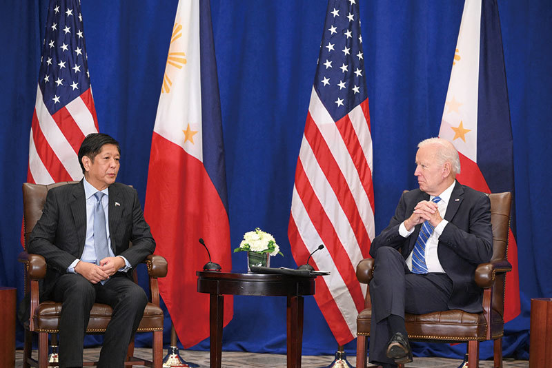 9月22日,菲律賓總統小馬科斯與美國總統拜登在聯合國大會期間舉行場邊會談,兩人承諾加強兩國盟友關係,強調對南海航行和飛越自由的支持,以此回應中共在南海的挑釁行為。(Mandel Ngan / AFP)