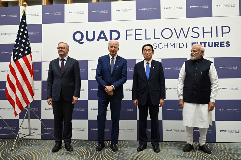 澳洲總理阿爾巴尼斯5月24日到訪日本參加美日印澳四方安全對話,推動印度加入「反華聯盟」。圖左起為澳洲總理阿爾巴尼斯、美國總統拜登、日本首相岸田文雄和印度總理莫迪。(Yuichi Yamazaki / Getty Images)