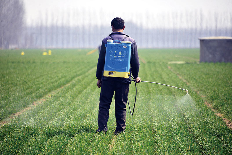 中國農民耕種的土地、居住的房屋都不能交易,因此不是他們的財產,構不成收入。圖為山東省聊城茌平縣一名農民在麥田噴灑農藥。(STR / AFP)
