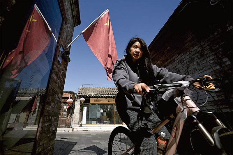 中共「人民共和國」裡,中共的權力和利益就像血旗上那顆頭號大星一樣,永遠都凌駕於人民和法律之上。圖為2022 年10 月11 日,北京巷弄內一名女子騎車經過中共五星旗。(Noel Celis / AFP)