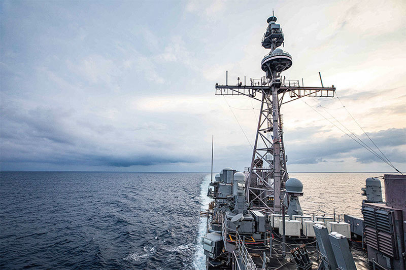 中共冒著與東南亞國家發生衝突的風險,繼續蠶食南中國海,並加大對台灣的軍事壓力。圖為2022年8月28日,美國USS Chancellorsville巡洋艦通過台灣海峽,以支持自由和開放的印太地區。(Justin Stack / US NAVY / AFP)