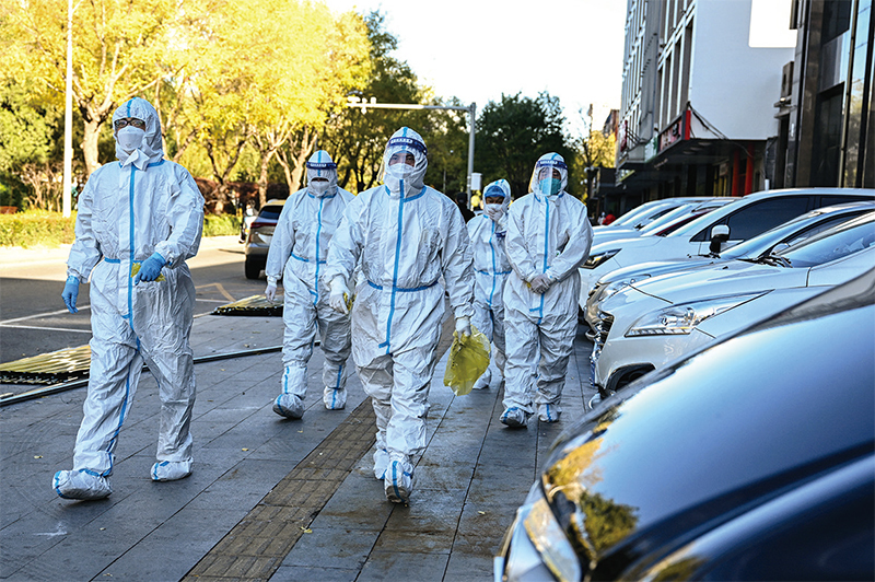 2022年11月13日,北京居民區「大白」出動防疫封控。(Noel Celis / AFP)