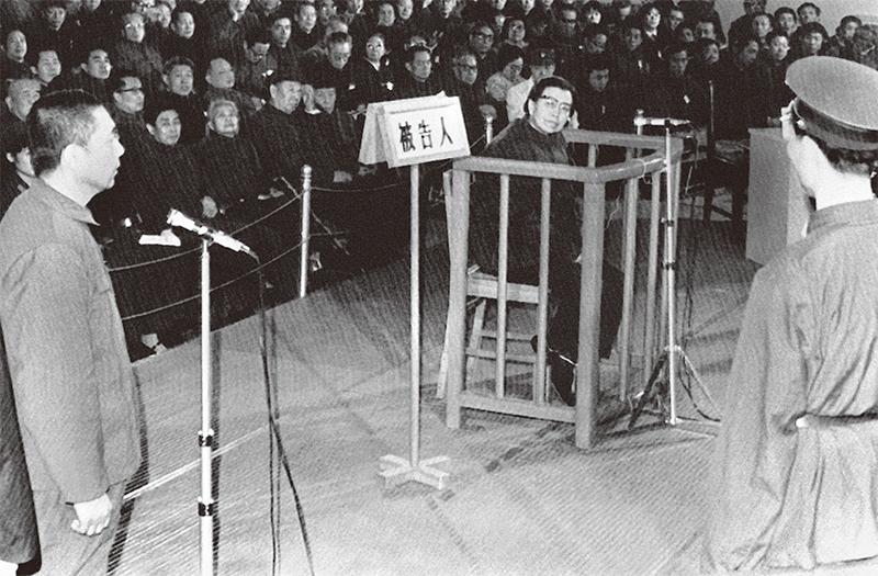 1980年11月27日,「四人幫」的被告人之一、老毛遺孀江青坐在被告席上,怒視著在審判期間出庭作證的另一名四人幫成員王洪文。(China Outxinhua / AFP)