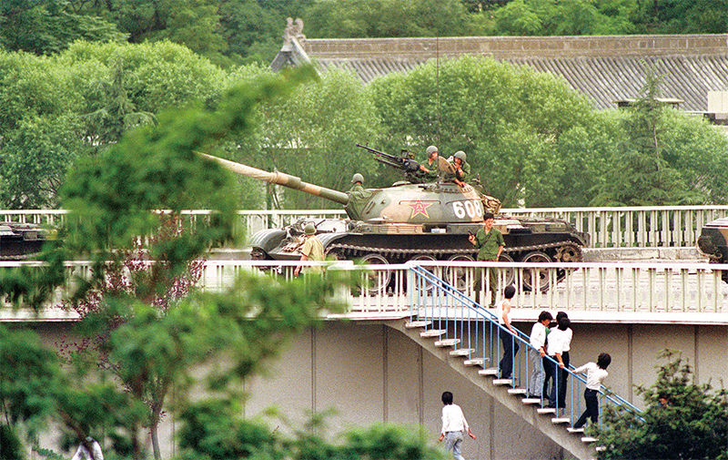天安門大屠殺翌日,1989年6月5日,坦克在北京外交大院附近的主要十字路口占據陣地,一名士兵用槍威脅民眾。(Catherine Henriette / AFP)