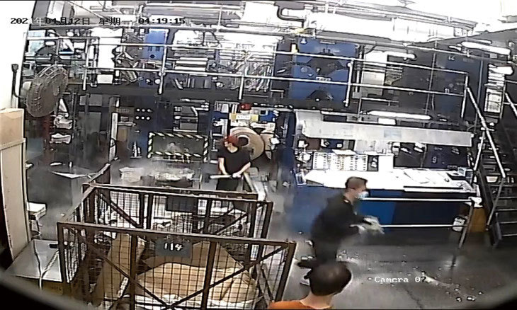 2021年4月12日凌晨4時,四名暴徒在強行闖入香港大紀元印刷廠,用大鐵鎚狂砸機器和設備。(影片截圖)