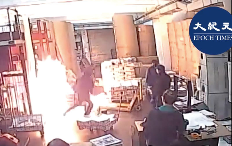 2019年11月19日凌晨,香港《大紀元時報》的印刷廠遭中共僱凶縱火。(影片截圖)
