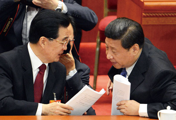 2013年3月5日中共人大會議開幕結束時,胡錦濤(左)與習近平密切交談。(Goh Cai Hin / AFP)