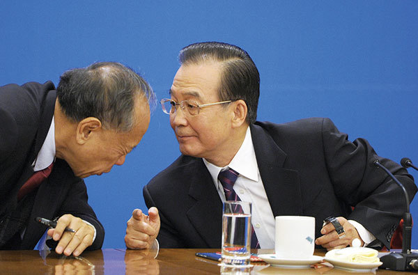 2012年3月14日,時任總理溫家寶(右)在中共兩會結束的中外記者會上,多次拒絕記者會主持人江派李肇星(左)阻攔發言,直到解答完王立軍問題才結束會議。(Liu Jin / AFP)