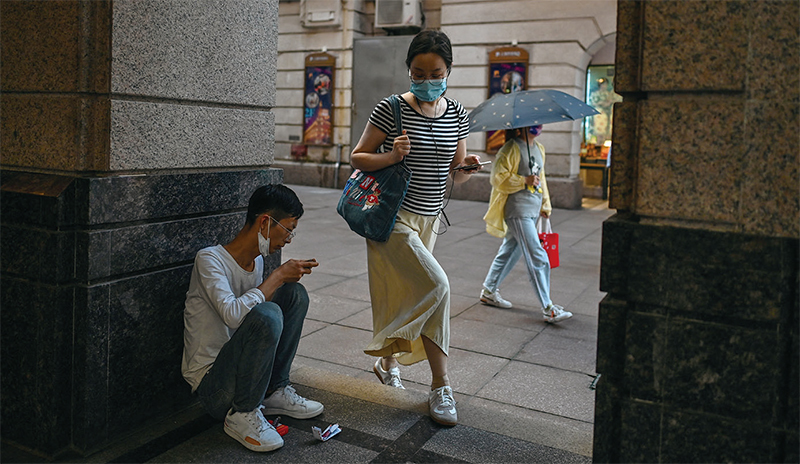 隨著中共使用高科技手段不斷變本加厲地加強對現代資訊管道的管控,八零後的幾代人也必然會越來越多地成為中共向左激進路上的障礙。圖為2021年8月5日,上海的一處購物區。(Hector Retamal / AFP)