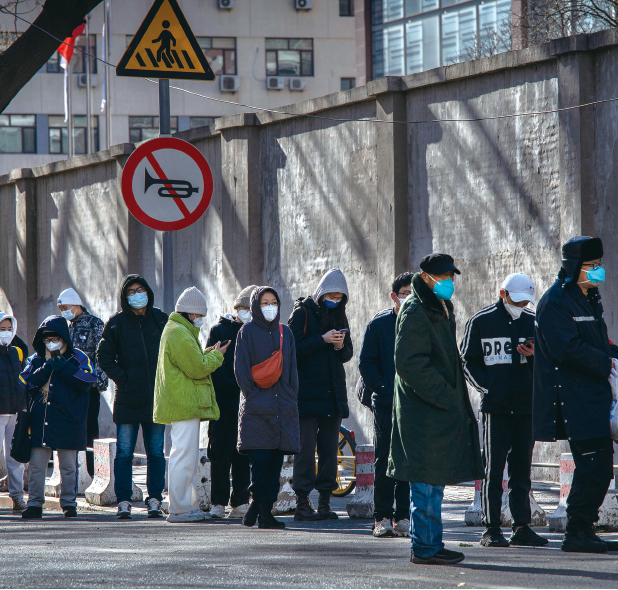 2022年12月11日上午,人們在中國北京一家醫院的發熱門診外排隊。(Kevin Frayer / GettyImages)