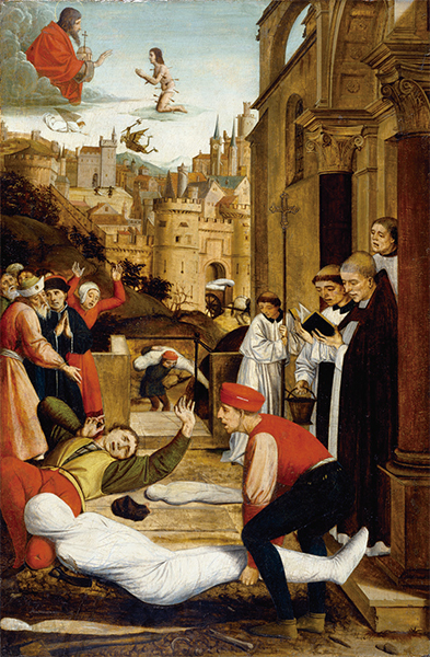 尼德蘭畫家若斯.列菲林西(Josse Lieferinxe),《聖塞巴斯蒂安代瘟疫災區向神祈禱》,1497年作,美國巴爾的摩市沃爾特斯藝術博物館藏。(公有領域)