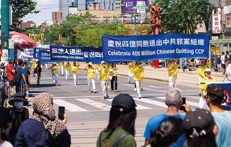 2022 年8 月6 日下午,多倫多部分法輪功學員在市中心舉行盛大遊行,慶祝四億中國同胞退出中共黨、團、隊。(艾文/大紀元)