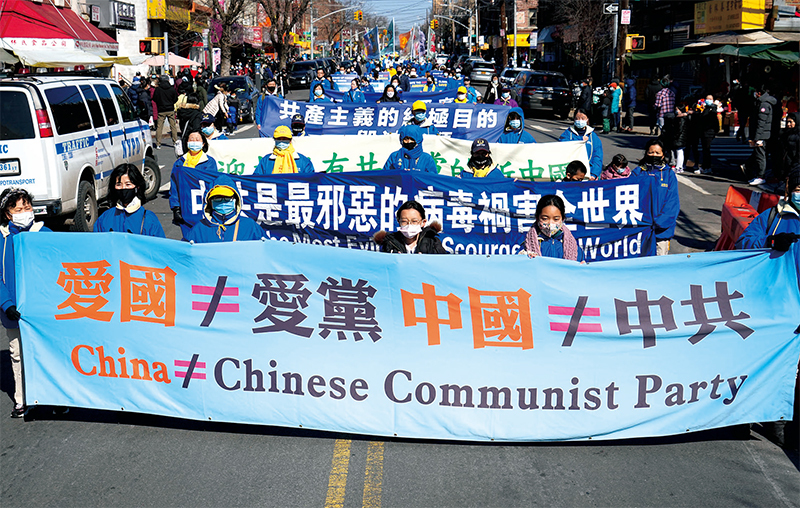 2022 年2 月27 日,紐約法輪功學員在布碌侖8 大道遊行聲援3.9 億勇士退出中共黨團隊。(戴兵/大紀元)