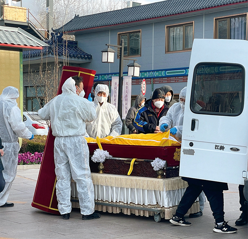 多家外媒報導,北京多個火葬場全天作業,甚至八寶山殯儀館每分鐘都有靈車進入。圖為2022年12月17日北京一家殯儀館轉移屍體。(Alessandro Diviggiano / Reuters)