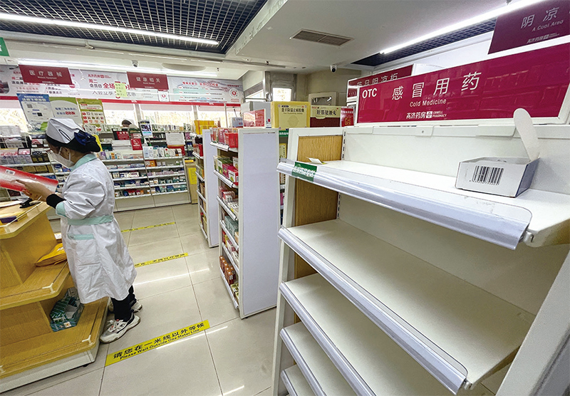 突發性的取消封控政策令全民陷入搶藥、買藥難、就醫人滿為患的境地。圖為2022年12月15日,一家藥店的感冒藥品被搶購一空。(Yuxuan Zhang / AFP)