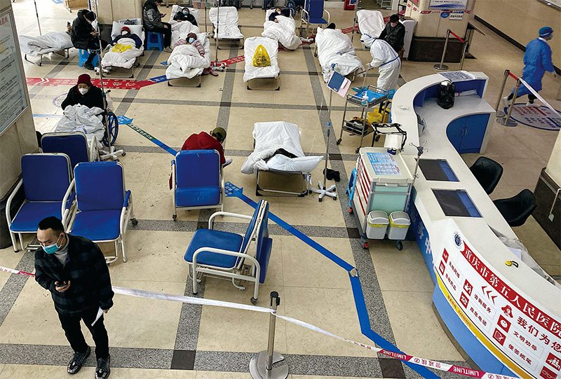 2022年12月23日,中國重慶市第五人民醫院的大廳裡COVID-19患者躺在病床上。(Noel Celis / AFP)