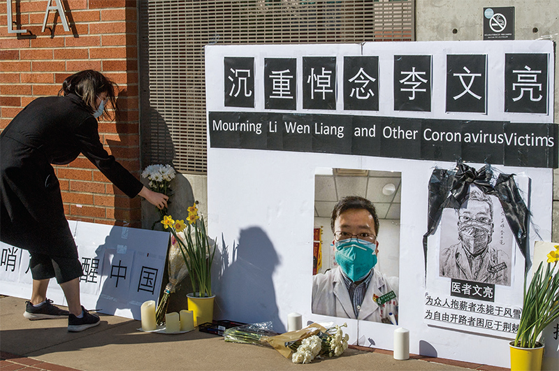 如三年前疫情在武漢爆發時相似,中共隱瞞這波疫情帶來的衝擊。圖為2020年2月15日,加州大學洛杉磯分校中國學生及支持者為疫情吹哨人李文亮舉行紀念活動。(Mark Ralston / AFP)