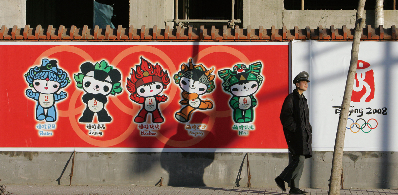 2008年北京奧運吉祥物五福娃。福娃最初叫喜娃,創意源自「人面魚紋盆」,是古代兒童的陪葬品。(Frederic J. Brown / AFP)