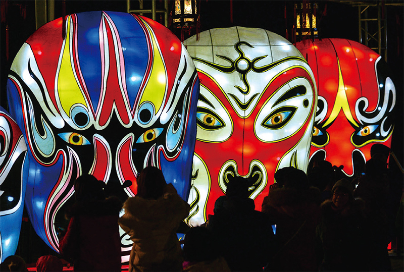 中國文藝界在2022年12月也傳出十多人死亡的消息,他們多數人參與中共宣傳。圖為2019年2月18日元宵節前夕,北京圓明園展示戲曲面具燈籠。(STR / AFP)