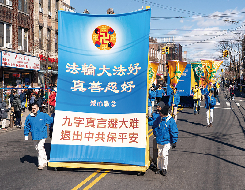 2020年3月1日,法輪功學員在紐約布碌崙遊行,向正處在大瘟疫災難中的民眾傳遞保平安的福音:誠心敬念「法輪功大法好,真善忍好」,「九字真言避大難,退出中共保平安」。(戴兵/大紀元)