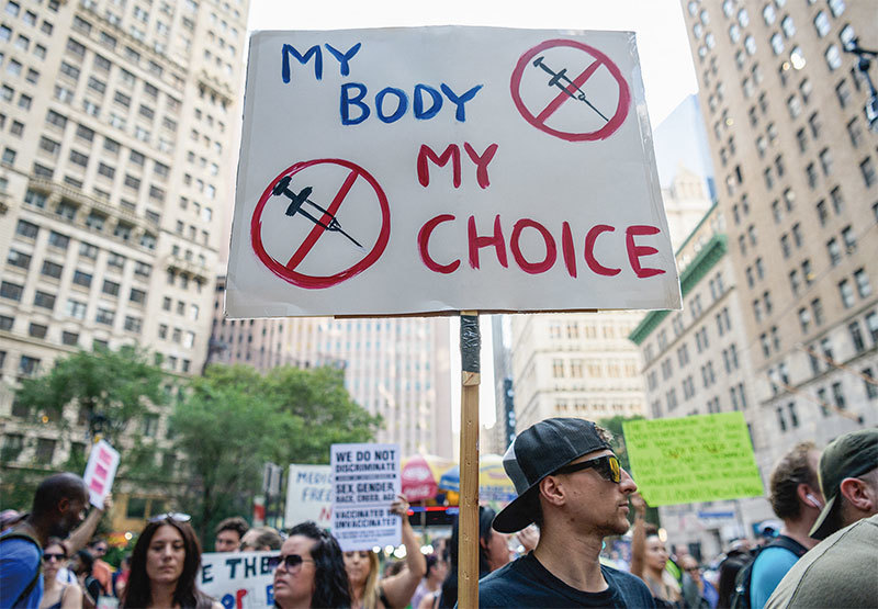 大量沒有被重複洗腦催眠的公眾都可以感覺到他們受到了操縱。圖為2021年8月25日在紐約市政廳前,反對COVID-19疫苗授權和疫苗護照的民眾。(Angela Weiss / AFP)