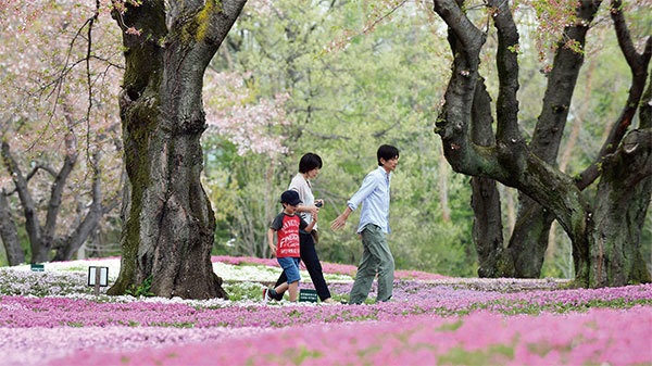 每周在戶外度過120分鐘(可以分成更小的時間段),與更好的健康和幸福感有關。圖為日本群馬縣館林市,一家人在公園花圃間漫步。(Kazuhiro Nogi / AFP)