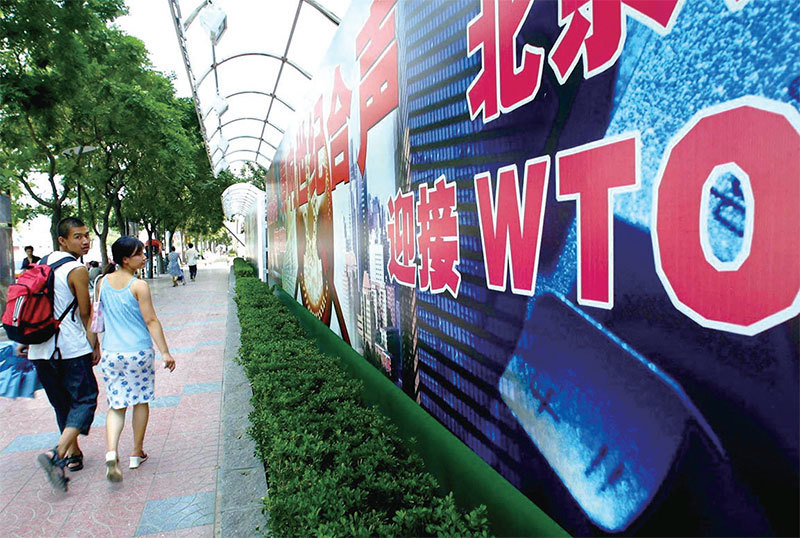 中共政權成為讓世貿功能失靈的最重要力量之一,世貿面臨被邊緣化的窘境。圖為2001年北京街頭的一處看板。(Goh Chai Hin / AFP)