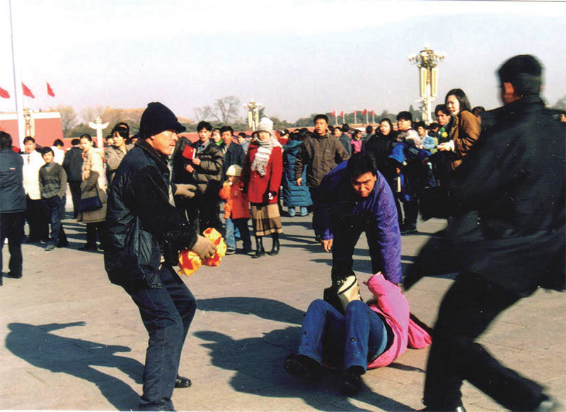 江澤民以欺騙方式加入世貿,一個主因在於中共迫害法輪功運動正在成為一項曠日持久的「對內戰爭」,急需大量外資的支援。圖為2002年上天安門廣場和平請願的法輪功學員遭便衣警察圍攻。(明慧網)