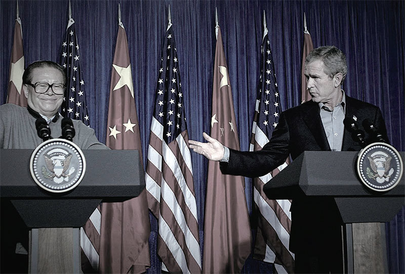 中共借助入世後逐漸壯大的貿易實力,既顛覆了世貿運行機制,也動搖了西方國家保護人權的立國之本。圖為江澤民(左)2002年10月「告別之旅」訪美時在美國前總統小布什(右)面前的醜態。(Paul Buck / AFP)