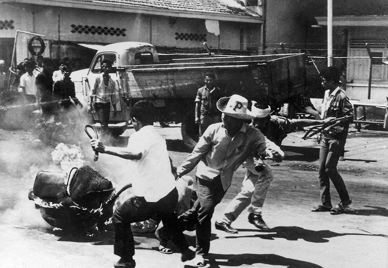 1960年代,周恩來一句「可以使東南亞一夜改色」引發東南亞國家「大排華」,印尼排華事件約50萬華人被屠殺。圖為1967年4月28日雅加達數百名印尼人在中共大使館前舉行暴力反華示威。(Panasia / AFP)