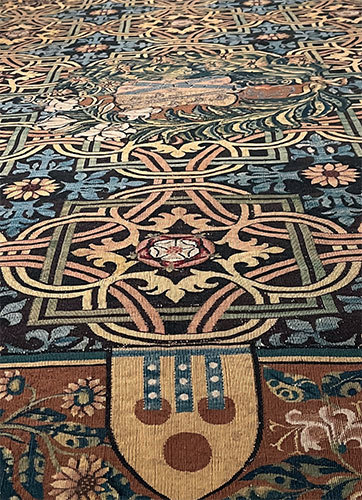 註1: 桌毯 (The Luttrell Table Carpet ca. 1514-1580)英格蘭或荷蘭南部,使用羊毛(經)、羊毛、絲、銀、鍍金銀金屬包線(緯)。傳統的英國凱爾特編織和花園迷宮相媲美,整面搭配金銀花和瑪格麗特雛菊與都鐸玫瑰。