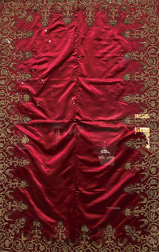 除了一幅框裱起來的紅色絲織品,是用在基督教洗禮儀式時包裹嬰兒用的布,用銀和鍍金的金屬線繡綴出燕尾花、百合、紫羅蘭、孔雀與一些會發光的昆蟲,至今仍閃閃發光,工藝精巧。但這個紅色令人怵目驚心,掛在壯麗的展場畫像與文物中,看起來特別刺眼。是暗示新舊教之爭所造成的殺戮嗎?除此之外,在這些精緻的藝術品中似乎聞不到都鐸王朝血腥的一面。