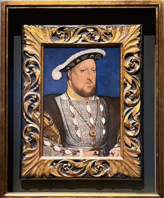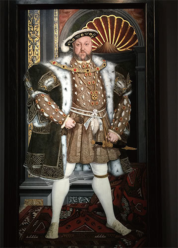 小霍爾班畫老去的亨利八世(大概50歲),略見鬆弛的面龐,華麗繁複綴滿寶石的衣著,畫家用當時最昂貴的黃色為衣服主色鈷藍為背景色,兩條腿叉開站立。這是一張揚威震懾的畫像,是畫家想出來的姿勢還是亨利自己?畫家精湛的技巧塑造了這位國王不可侵犯性與威武的形象。