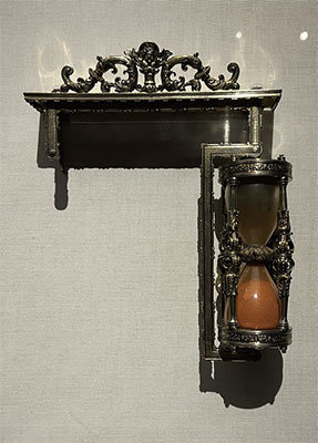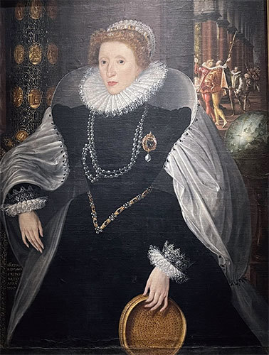 除了都鐸式的微型迷你畫,另有多幅大尺寸的伊莉莎白女王肖像畫,每一幅都展示了不同的意象與不同階段的她,藉由衣飾、布景,寓言式地表現女王統治王朝的階段性。有一張她穿黑衣站立在房間裡,手持篩子,背對著房間外迴廊裡是她的朝臣。她可不是要去做麵包,篩子替代典型女性的配飾,如扇子或書本。「根據羅馬傳說,一個女人在篩子裡打水來證明她的童貞。伊麗莎白在許多肖像畫中都使用了這種靜態隱喻式的畫像,來確立她作為女性統治者的地位。」——策展人的說明。